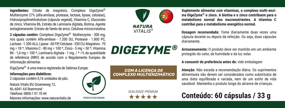Esta é a razão pela qual recomendamos fortemente nosso produto Digezyme®: um complexo multienzimático exclusivo e patenteado com as cinco enzimas digestivas mais importantes em alta dosagem. Estes incluem alfa amilase, protease, lactase, lipase e celulase. O especial do Digezyme® é que as enzimas aqui contidas são dosadas em uma proporção muito específica entre si, de modo a ajudar na digestão de nutrientes como proteínas, carboidratos, gorduras e fibras da melhor maneira possível. Além disso, todas as enzimas em Digezyme® se encontram numa forma extremamente pura e de mais alta qualidade, pos são produzidas a partir de fungos e bactérias por fermentação e, portanto, estão livres de ingredientes de origem animal ao mesmo tempo. Esta é uma informação importante não apenas para todos os vegetarianos, porque as enzimas digestivas em produtos semelhantes muitas vezes vêm do pâncreas de porcos ou bovinos e não são desta puras. Além disso, nosso complexo multienzimático é isento de engenharia genética e glúten e, portanto, também é adequado para pessoas com intolerância ao glúten.